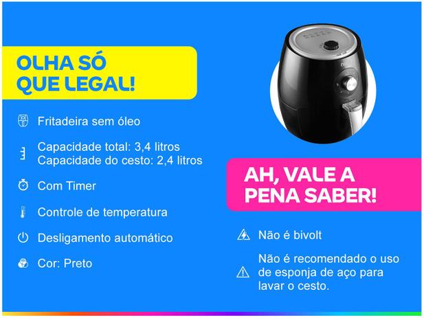 A fritadeira na cor preta é compacta e produzida em PP, ocupando menos espaço, possui luz indicadora de funcionamento, controle de temperatura, cesta removível antiaderente, capacidade total de 3,4L e cesto com capacidade de 2,4L.